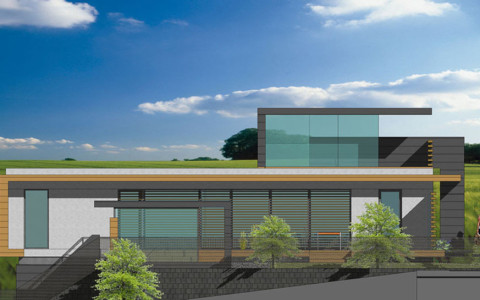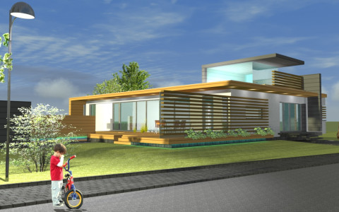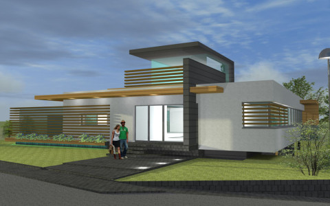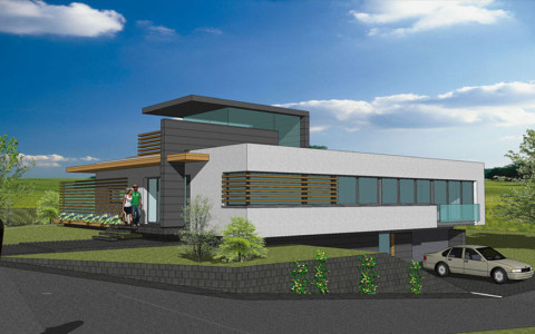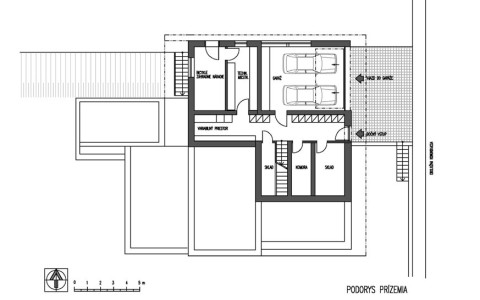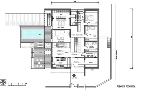 Na severnom svahovitom, rohovom pozemku so sklonom od cesty požadoval investor netradičnú, maximálne modernú architektúru s bývaním na jednej úrovni a v maximálnej miere s prepojením hlavných bytových funkcii s exterierovou záhradou. Sklon terénu je využitý na umiestnenie garáže, technických , obslužných a skladových priestorov v “podzemnom podlaží“. Zároveň z tejto úrovne je bočný vstup s vnútorným komunikačným prepojením na hlavný vstup s prízemia. Dispozičnoprevádzkové riešenie hlavného podlažia diferencuje dennú a nočnú časť bytu s možnosťou autonómnej prevádzky izieb vo východnom trakte. Spálňa rodičov, denné priestory včítane kuchyne sú priamo napojené na veľkú terasu. Terasu od príľahlej miestnej komunikácie oddeľuje originálne riešená lamelovo presklená stena. Na terasu nadväzuje bazén s protiprúdom a zásuvnou strechou. Schodiskový priestor je vyvedený až na strechu kde strešná terasa ponúka panoramatické výhľady na okolitú prírodnú scenériu. Zároveň strešná nádstavba tvorí svetlík presvetľujúci komunikačný priestor uprostred domu. Priestor obývacej izby od jedálne predeľuje panoramatický krb osadený v zelenom páse prenikajúceho z exterieru.