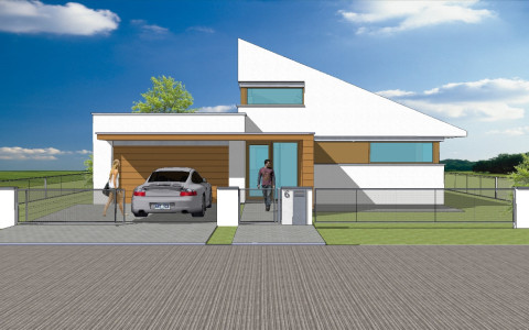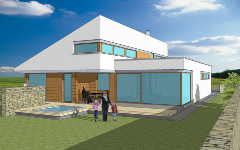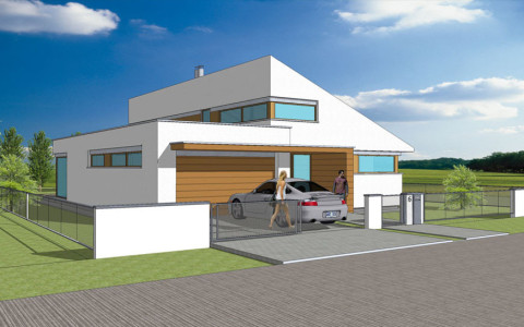 Navrhovaná je originálna architektúra, s určujúcim vplyvom pultovej šikmej strechy a prieniku jednopodlažného „kvádra“. Rodinný dom je navrhovaný ako jednojpodlažný objekt s obytným podkrovím bez podpivničenia. Z hľadiska dispozičnoprevádzkového je diferencovaná nočná a denná zóna . V ich prieniku sú sústredené obslužné funkcie s kumuláciou inštalačných rozvodov. Technologické zariadenia a komíny sú sústredené v technickej miestnosti umiestnenej v centre objektu. Hlavné pobytové priestory sú vizuálne prepojené s exterierom zasklenými stenami... Obytné izby na poschodí sú presvetlené rohovými pásovými oknami s orientáciou na južnú stranu.