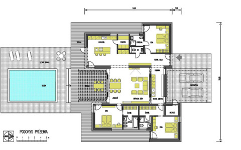 Všetky obytné priestory sú priamo prepojené na exterierové terasy so zachovaním intimity spálni a jednotlivých izieb. Veľkoryso navrhnutá kuchyňa umožňuje jej dokonalú funkčnosť aj vo vzťahu k prepojeniu na stolovanie v jedálni aj terase. Navrhované prekryté „átrium“ ho dokonalé opticky izoluje od okolitých susedov... Nadštandardné izby sú navrhované s možnosťou ich využitia bez rušenia dennej časti, čo vytvára predpoklady aj pre možnosť dvojgeneračného bývania. Technologické zariadenia sú sústredené v blokovej forme do technickej miestnosti.