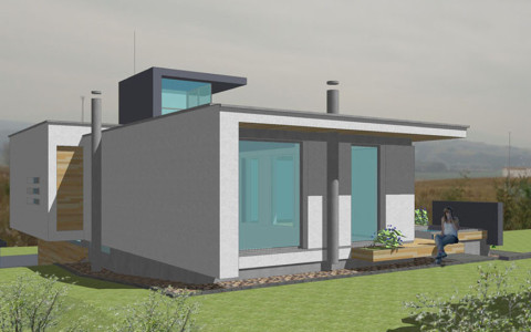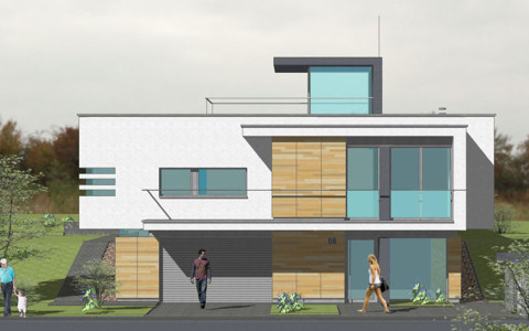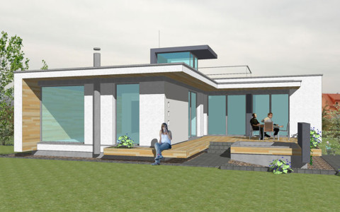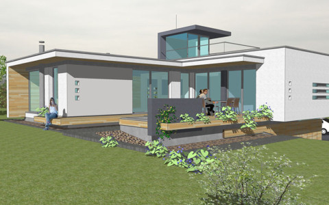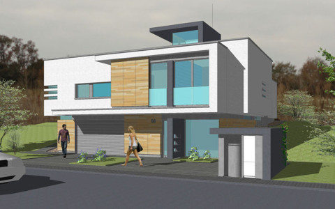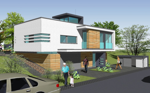 Navrhovaná je originálna architektúra, s určujúcim vplyvom plochej strechy a kolmého prieniku hmôt „kvádrov“ prízemia a poschodia.. Rodinný dom je navrhovaný ako dvojpodlažný objekt s obytnou časťou na druhom nadzemnom podlaží. Z hľadiska dispozično-prevádzkového je diferencovaná nočná a denná zóna . V ich prieniku sú sústredené obslužné a komunikačné funkcie s kumuláciou inštalačných rozvodov, sústredených v technickej miestnosti na prízemí. Hlavné pobytové priestory sú vizuálne prepojené s exterierom zasklenými stenami. Točité schodisko je vyvedené až na strechu 2. podlažia. Schodisková presklená nádstavba presvetľuje vnútorné priestory až do prízemia. Náväzná strešná terasa umožní relax s panoramatickým výhľadom na horský masív Slánskych vrchov.